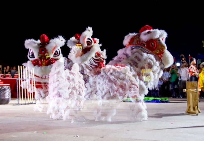 Màu sắc rực rỡ của trang phục lân kết hợp với âm thanh trống chiêng tạo không khí náo nhiệt. Mọi người vỗ tay cổ vũ nhiệt tình.